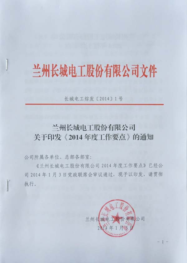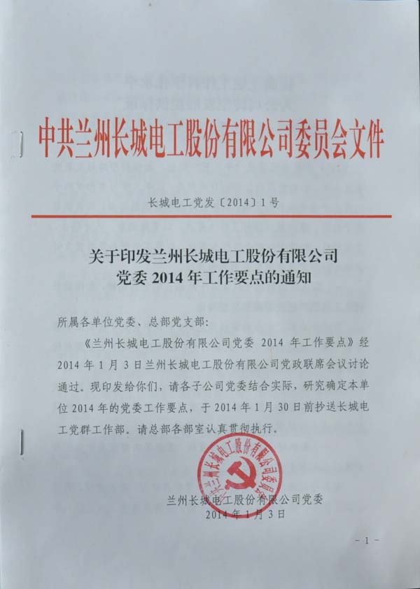 1月3日,公司黨委和行政分別下發(fā)《關(guān)于印發(fā)蘭州長城電工股份有限公司黨委2014年工作要點(diǎn)的通知》(長城電工黨發(fā)〔2014〕1號(hào))和《蘭州長城電工股份有限公司關(guān)于印發(fā)<2014年度工作要點(diǎn)>的通知》(長城電工綜發(fā)〔2014〕1號(hào)),對(duì)公司2014年度黨委和行政工作進(jìn)行了安排部署。